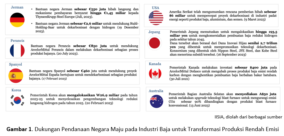 Sepanjang tahun 2023, negara-negara Uni Eropa telah berkomitmen memberikan bantuan pendanaan kepada berbagai perusahaan baja di kawasan Eropa untuk melakukan transformasi teknologi produksi menjadi green steel dengan nilai mencapai sekitar lebih dari €10 miliar. Pemerintah Amerika Serikat pada bulan Maret 2023 telah mengumumkan bantuan pendanaan senilai USD6 miliar untuk mendukung dekarbonisasi pada industri intensif energi, termasuk baja. Sebelumnya, Pemerintah Jepang, pada Februari 2023, juga telah berkomitmen untuk memberikan bantuan pendanaan senilai ¥193,5 miliar atau sekitar USD1,34 miliar untuk mendukung proses komersialisasi produksi baja berbasis hidrogen. Dukungan pendanaan ini merupakan bagian dari Green Innovation Fund sebesar ¥2,7 triliun. Pada bulan yang sama, Pemerintah Korea Selatan, juga sudah berkomitmen untuk memberikan dukungan pendanaan sebesar ₩ 26.9 miliar penyelesaian pengembangan teknologi reduksi besi pada tahun 2025. Selain negara-negara tersebut, Kanada dan Australia juga telah menyiapkan dukungan pendanaan bagi industri baja masing-masing untuk dapat mengadopsi teknologi produksi baja rendah emisi karbon masing-masing sebesar USD400 dan 105 juta. Detail informasi lebih lanjut disajikan pada Gambar 1.