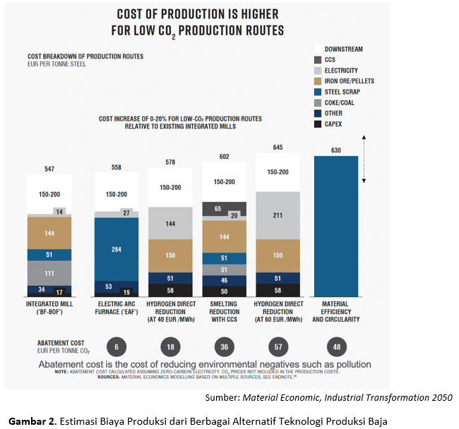 Tanpa dukungan pendanaan dari Pemerintah sebagaimana dilakukan oleh negara-negara maju, industri baja tidak akan memiliki kemampuan untuk mendanai perubahan teknologi menuju produksi rendah emisi dan akan kehilangan daya saing. Hal ini terutama disebabkan tingginya biaya investasi yang harus dikeluarkan untuk mengadopsi teknologi rendah emisi dan peningkatan biaya produksi yang akan menjadi beban. Sebagaimana disajikan pada Gambar 2, biaya produksi dapat meningkat hingga 20% pada jalur produksi rendah emisi dibandingkan jalur produksi konvensional. Sumber lain, Boston Consulting Group (BCG), memprediksi kenaikan yang relatif lebih tinggi hingga 30-70% bergantung jalur teknologi dan target emisi. Kenaikan biaya produksi sebesar ini dipastikan akan membuat industri baja tidak akan mampu bersaing tanpa adanya dukungan pendanaan dan kebijakan pemerintah. Oleh karena itu, berbagai negara maju telah mengambil langkah insiatif dengan memberikan dukungan pendanaan agar industri baja masing-masing dapat memenuhi target penurunan dan tetap dapat menjaga daya saing secara global.