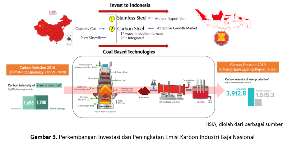 Investasi yang dilakukan di Indonesia terutama didorong oleh larangan ekspor mineral yang diberlakukan oleh pemerintah serta pertumbuhan konsumsi baja domestik yang menarik. Larangan ekspor mineral, khususnya bijih nikel, telah menarik minat investor produsen baja nir karat (stainless steel) untuk berinvestasi di Indonesia guna mengamankan pasokan bahan baku bagi industri baja nir karat di Tiongkok sekaligus meningkatkan akses pasar global. Di sisi lain, investor baja dari Korea dan Tiongkok juga melihat daya tarik pasar baja karbon Indonesia yang terus mengalami pertumbuhan dan akan terus tumbuh pesat dalam jangka-panjang. IISIA memperkirakan bahwa Indonesia akan memerlukan baja hingga lebih dari 100 juta ton untuk pembangunan Indonesia Emas. Baik investasi di sektor baja nir karat dan baja karbon, sebagian besar menggunakan jalur proses berbasis batu bara. Hal inilah yang mengakibatkan Indonesia mengalami peningkatan emisi karbon secara signifikan. Pada tahun 2016 emisi karbon industri baja nasional diperkirakan sekitar 1.656 kg CO2/ton produk, di bawah rata-rata emisi baja global,  dan meningkat tajam menjadi 3.913 kg CO2/ton produk pada tahun 2019 (Gambar 3)