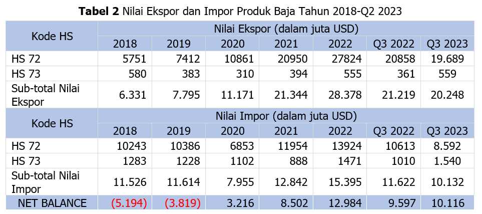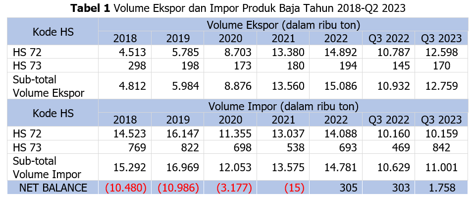 Volume ekspor produk baja kode HS 72 dan 73 terus menunjukkan peningkatan sejak tahun 2018 sampai tahun 2022 tidak mengalami dampak negatif COVID-19. Tren peningkatan ekspor ini berlanjut hingga Q3 2023 di mana volume ekspor produk baja menunjukkan peningkatan sebesar 1,8 juta ton atau sekitar 16,7 persen jika dibandingkan dengan periode yang sama pada tahun sebelumnya. Di sisi lain, volume impor produk baja sepanjang tahun 2018-2022 terlihat berfluktuasi dan terdampak COVID-19. Pada tahun 2018-2019 volume impor meningkat dan kemudian turun pada tahun 2020 akibat COVID-19. Pasca COVID-19, volume impor pada periode 2021-2022 meningkat yang berlanjut pada Q3 2023 dengan peningkatan sebesar 372 ribu ton atau tumbuh sekitar 3,5 persen jika dibandingkan dengan periode yang sama tahun 2022 (Tabel 1).