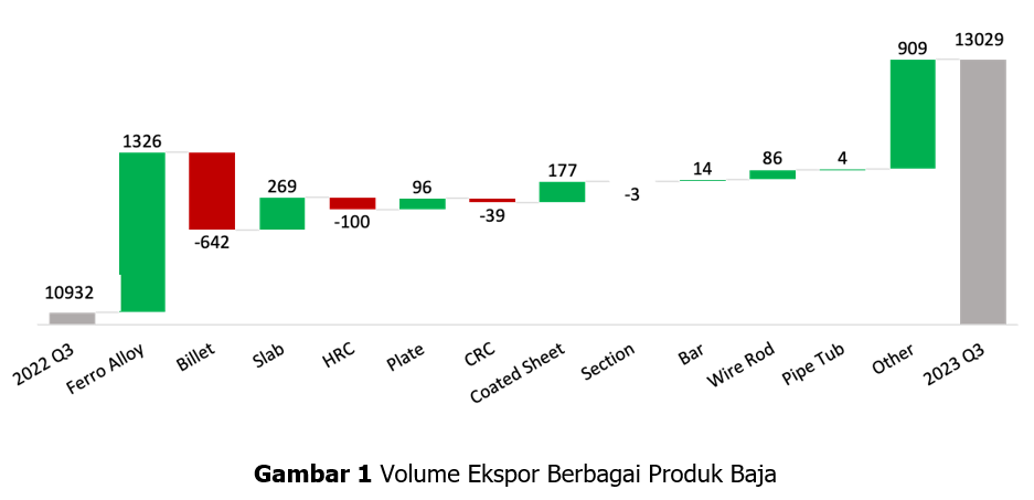 Produk yang sangat berkontribusi pada volume ekspor besi dan baja nasional hingga Q3 2023 adalah Ferro Alloy sebesar 1,3 juta ton, Slab sebesar 269 ribu ton, Coated Sheet sebesar 177 ribu ton, Plate sebesar 96 ribu ton, serta kelompok produk “other” yang terdiri dari Pig Iron yang meningkat sebesar 871 ribu ton, HBI 34 ribu dan scrap 5 ribu ton. Namun, beberapa produk menunjukkan penurunan ekspor jika dibandingkan periode yang sama pada tahun sebelumnya, seperti Billet sebesar 642 ribu ton, Hot Rolled Coil 100 ribu ton, Cold Rolled Coil sebesar 39 ribu ton, dan Section sebesar 3 ribu ton (Gambar 1).