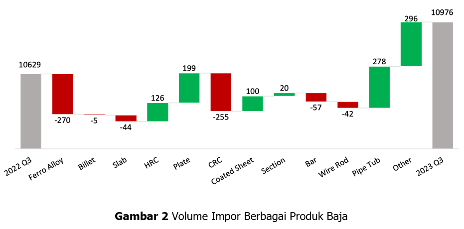 Sementara itu, impor turun pada produk Ferro Alloy sebesar 270 ribu ton, Cold Rolled Coil sebesar 255 ribu ton, Bar sebesar 57 ribu ton, Slab 44 ribu ton, Wire Rod 42 ribu ton, dan Billet 5 ribu ton. Namun, terjadi juga peningkatan volume impor pada beberapa produk seperti Pipe & Tube sebesar 278 ribu ton, Plate sebesar 199 ribu ton, Hot Rolled Coil sebesar 126 ribu ton, Coated Sheet sebesar 100 ribu ton, dan Section sebesar 20 ribu ton. Segmen produk yang mengalami peningkatan ini merupakan segmen produk yang beririsan dengan produk yang dihasilkan produsen baja nasional (Gambar 2). Selain itu terdapat kelompok produk “other” yang mengalami peningkatan sebesar 296 ribu ton yang terdiri terutama terdiri atas Pig Iron sebesar 177 ribu ton dan scrap sebesar 134 ribu ton. Baik Pig Iron maupun scrap merupakan bahan baku yang dibutuhkan oleh industri besi dan baja nasional.